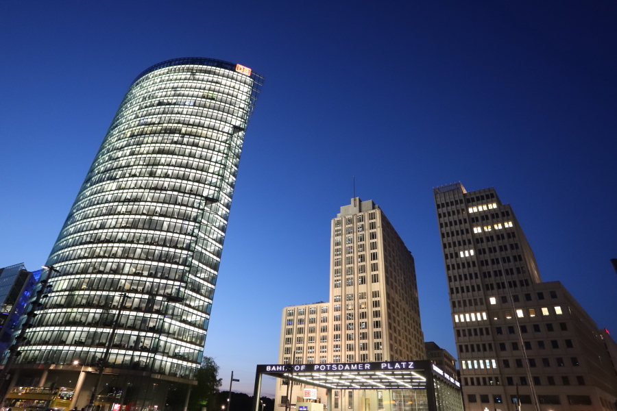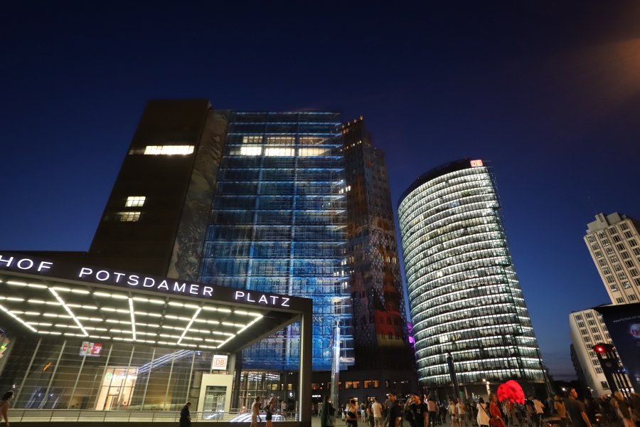 Potsdamer Platz, a traffic hub of interwar Berlin, was rebuilt in the 2000s after having been a no-man’s-land throughout the city’s partition. Two very tall buildings, accompanied by a third lower one, open the perspective to the West, the Sony center and the Kulturforum.