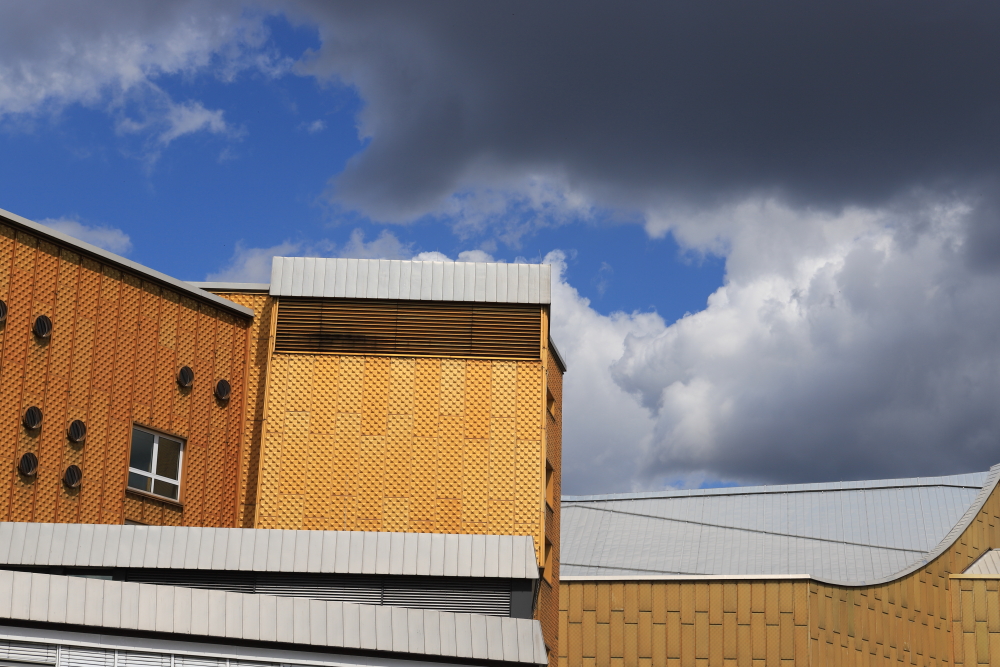Celui qui est le plus frappants, par sa couleur et sa forme, c’est la philharmonie. En fait c’est un ensemble qui regroupe différentes constructions, le dernier ajout date des années 80.