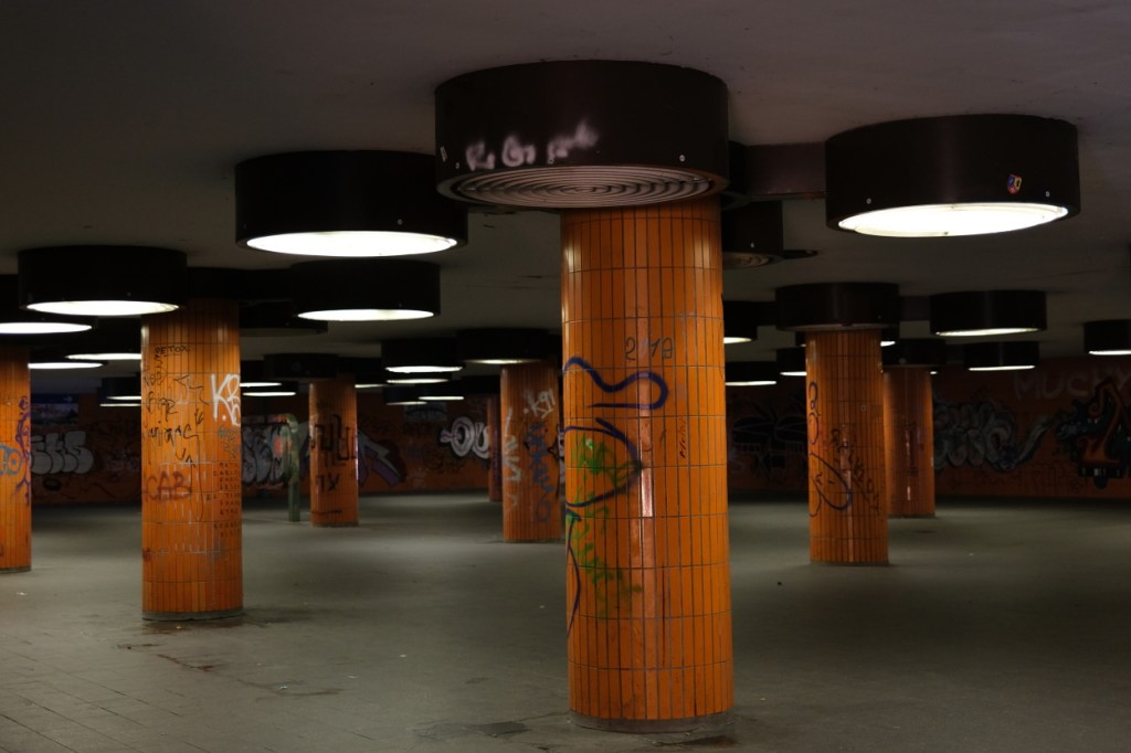Le mobilier urbain est lui aussi caractéristique des années 70, y compris les couleurs utilisées dans la station de métro :